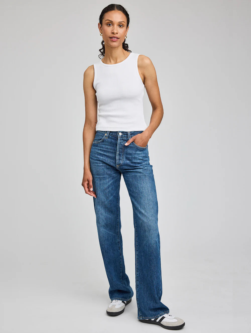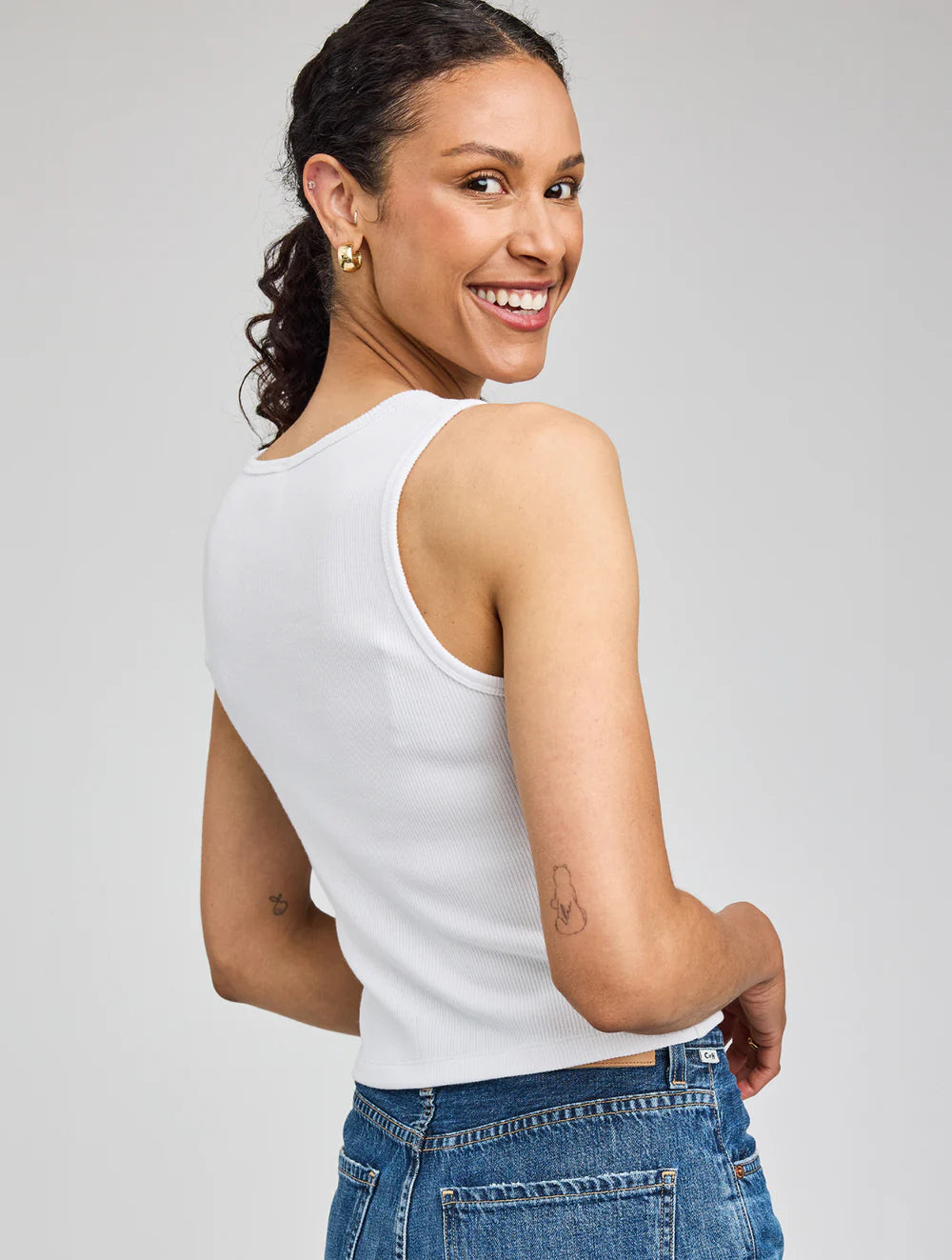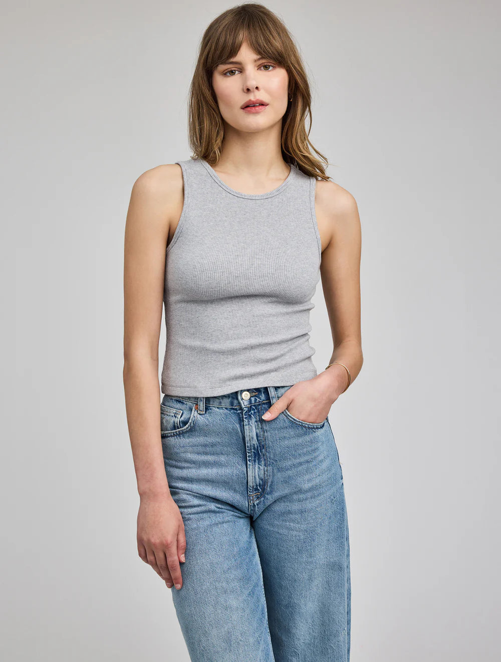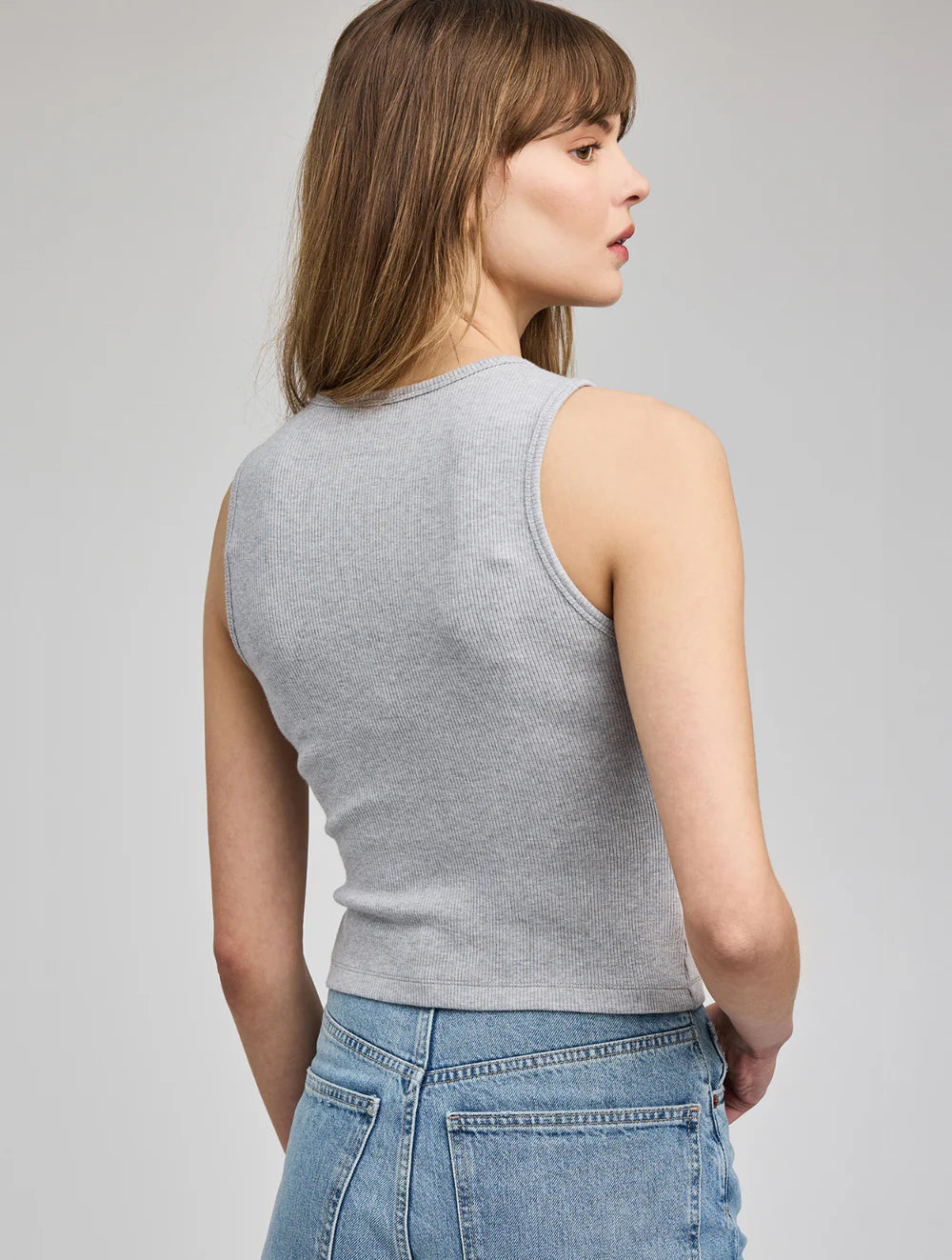 The Daria is a ribbed tank with a scoop neckline. It is made from a mini rib, and hits right at the waist.