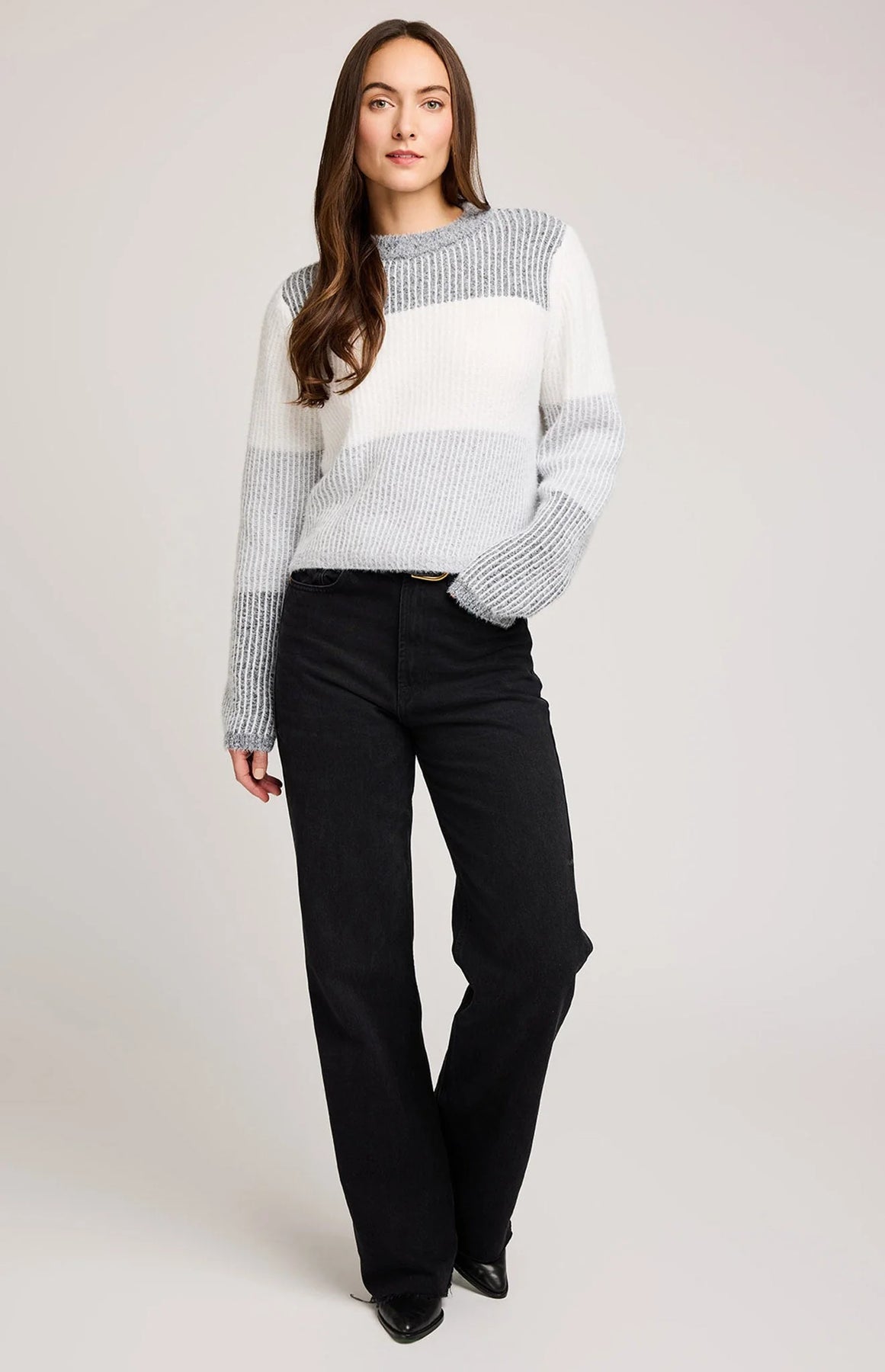 The Lucille sweater is made of a plush yarn in a tonal color blocked stripe. Features include a crew neckline and perfectly cropped length.