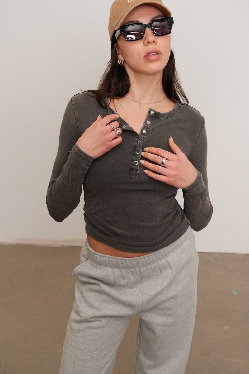 This vintage-washed henley offers a refined silhouette with its fitted shape and classic button-up front. The signature vintage wash delivers a timeless, worn-in appearance, combining effortless style with comfort. Perfect for elevating casual wardrobes with a sophisticated touch.