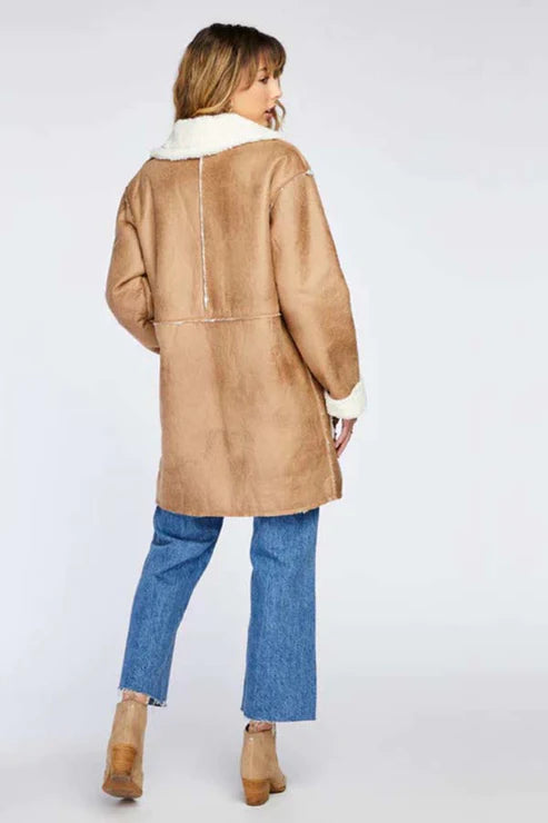 Made from faux suede with a faux shearling, this jacket is absolute perfection!